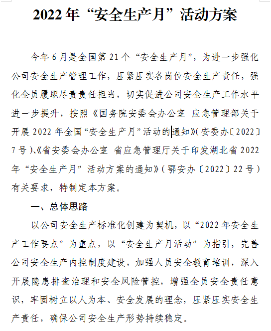 5月31日,公司研究制定了《2022年“安全生產(chǎn)月”活動方案》,成立了“安全生產(chǎn)月”活動領(lǐng)導(dǎo)小組,并以活動領(lǐng)導(dǎo)小組為核心,全面部署開展安全生產(chǎn)月專項活動,積極動員公司全員參與,充分彰顯了領(lǐng)導(dǎo)帶頭抓安全、人人講安全的良好風(fēng)貌。