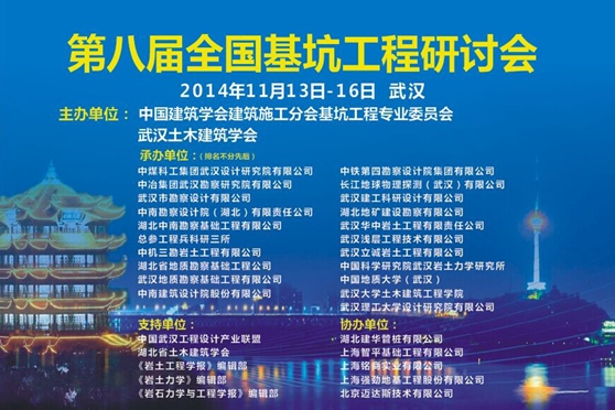 2014年11月14日,第八屆全國(guó)基坑工程研討會(huì)在武漢市洪山賓館隆重召開。此研討會(huì)每?jī)赡昱e辦一次,是國(guó)內(nèi)基坑工程技術(shù)專業(yè)的頂級(jí)交流活動(dòng)。本次大會(huì)共有來(lái)自全國(guó)各地的行業(yè)精英700余人參加,并邀請(qǐng)到龔曉南、劉祖德、范士凱、顧金才、黃強(qiáng)、唐雨耕、宋二祥、鄭剛、王衛(wèi)東、徐武建、彭浩、張曠成等工程院院士、全國(guó)頂尖大師、知名學(xué)者及重要領(lǐng)導(dǎo)作為與會(huì)嘉賓,大家齊聚一堂,共襄盛會(huì)。